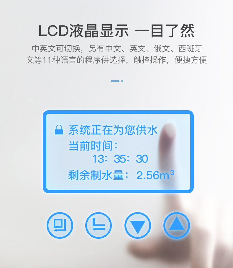 ·食品衛(wèi)生級高容量交換樹脂,效果好,壽命高采用LCD大屏幕顯示,中英文等多國語言可選